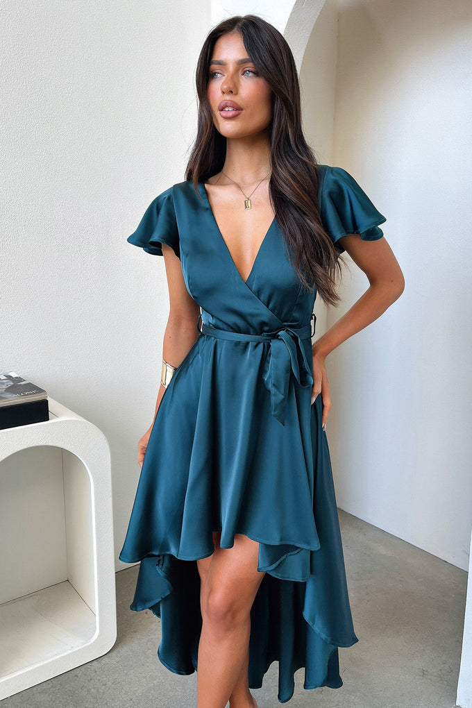 Get ready to turn heads in our Amelia Dress! This playful mini dress features short sleeves, a flowy train on the back, and a v neckline that adds a touch of elegance. With a waist belt to accentuate your figure and an invisible zip for a seamless look, this emerald dress is perfect for any special occasion. Pair it with black heels and gold jewelry for a glamorous look!