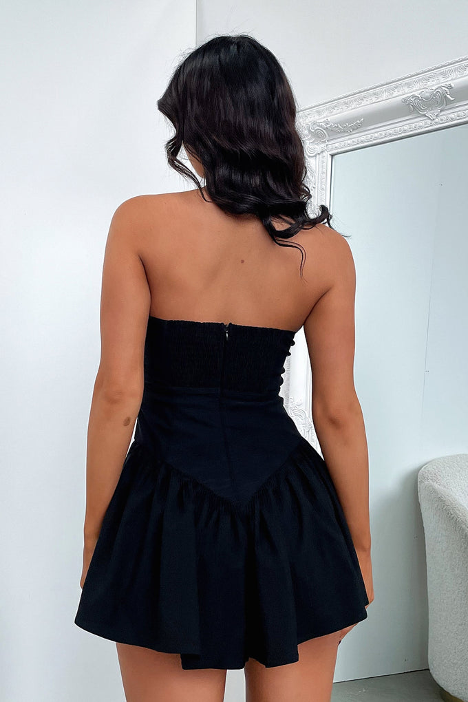 Summer just got better with the Arla Playsuit! She offers a sweetheart neckline, double lined material, v shaped waistline design, a flowy skirt and an invisible back zipper. Match her with black sandals and a tote for a summer picnic.