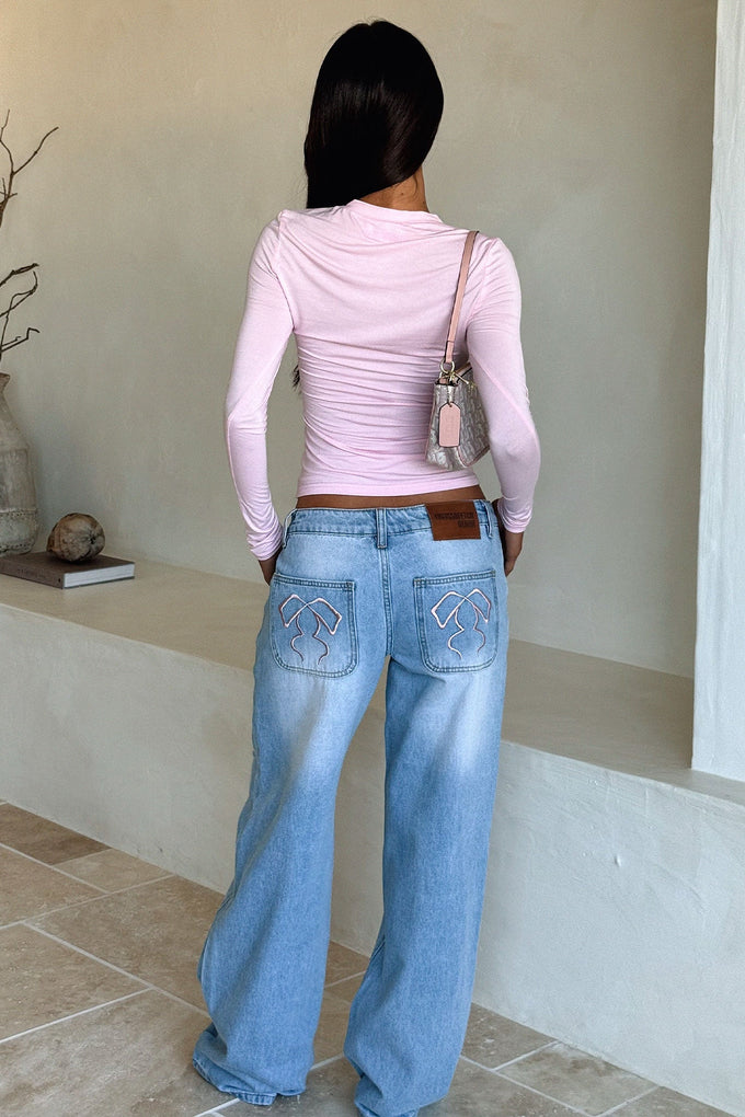 Mix comfort and style with the Avelyn Low Rise Jeans in blue! Featuring a trendy wide leg fit and playful rips, these jeans stand out with pink bow embroidery on the pockets and a signature THATSSOFETCH leather patch. Designed with belt loops, a double snap button, zip front closure, and four functional pockets, they blend practicality with flair. Pair them with a cute crop top and sneakers for an effortlessly cool, casual look!