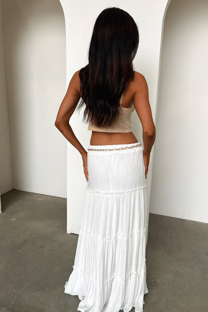 Get ready to elevate your summer wardrobe with the Dunne Maxi Skirt in White. Featuring a flowy fit and double lining, this skirt is ideal for any warm-weather occasion. The elasticized waistband adds comfort and versatility, perfect for styling with a cute crop and sandals for a picnic date!