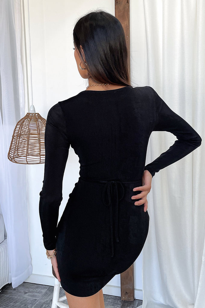 An elegant beauty! The eserta Dress is stealing our hearts with her stunning design, featuring a cut out detail between the bust and along the waistline, long fitted sleeves and double lined material. Match her with black wedges, soft wavy curls and a gold pendant necklace for a sweet cocktail fit.