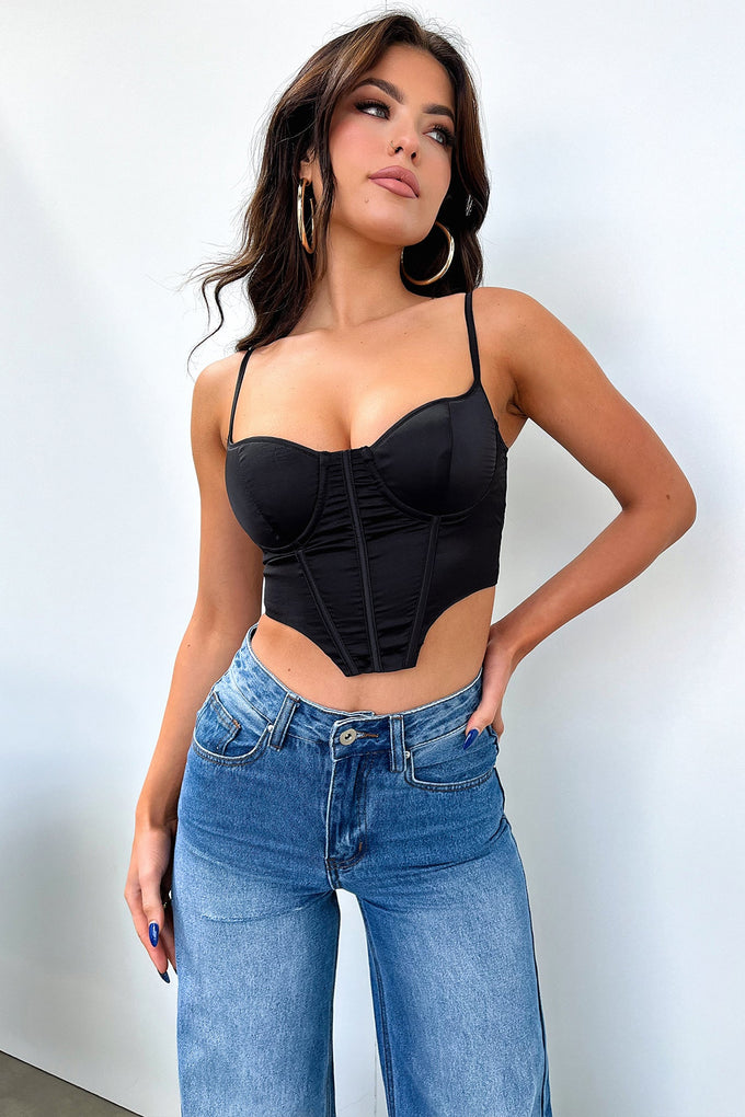 She's a NEED not a want! The new Fauna Corset Top offers a downward v-shaped waistline with boning details, cupped busts with lining underneath, thin adjustable straps and a tie up back detail to cinch the waist. Style her with a black silk midi skirt, black strappy heels and a glammed up face for a sexy sweet look.