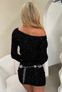 Introducing the Jarvis Long Sleeve, featuring on-trend off the shoulder style and flared sleeves for a fun and playful look. Made from cozy knitted material with sparkling sequins, this top pairs perfectly with the matching Jarvis mini skirt. Upgrade your wardrobe with Jarvis!