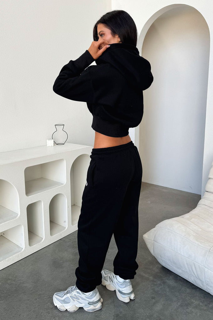 Stay comfy and stylish in the Kaztek Cropped Jacket. Its soft material and long sleeves make it perfect for lounging, while the embroidered TSF logo and silver zip add playful details. With a hood and cropped fit, it pairs perfectly with the Kaztek low rise sweatpants and ugg boots.