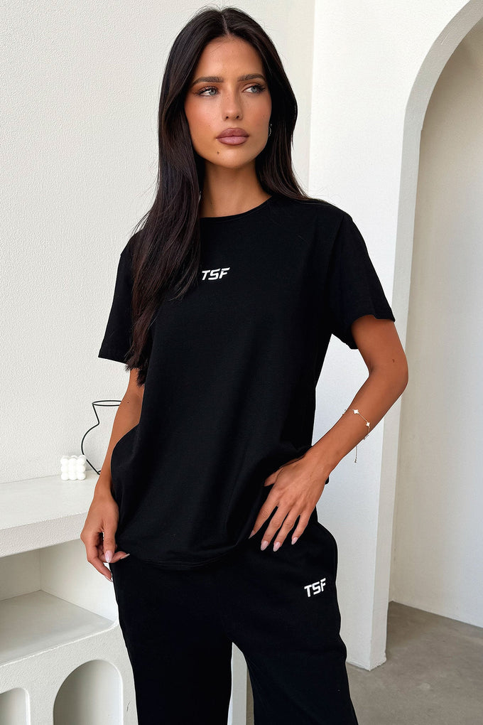 Get ready to lounge in style with the Kaztek Oversized Tee! This short sleeve oversized tee features a slouchy fit and round neckline, perfect for a casual and comfortable look. Made with soft material and embroidered with the TSF logo, it's the ideal basic for both gym cover-up and lazy days. Complete the look with our Kaztek low rise shorts for the ultimate laid-back ensemble!