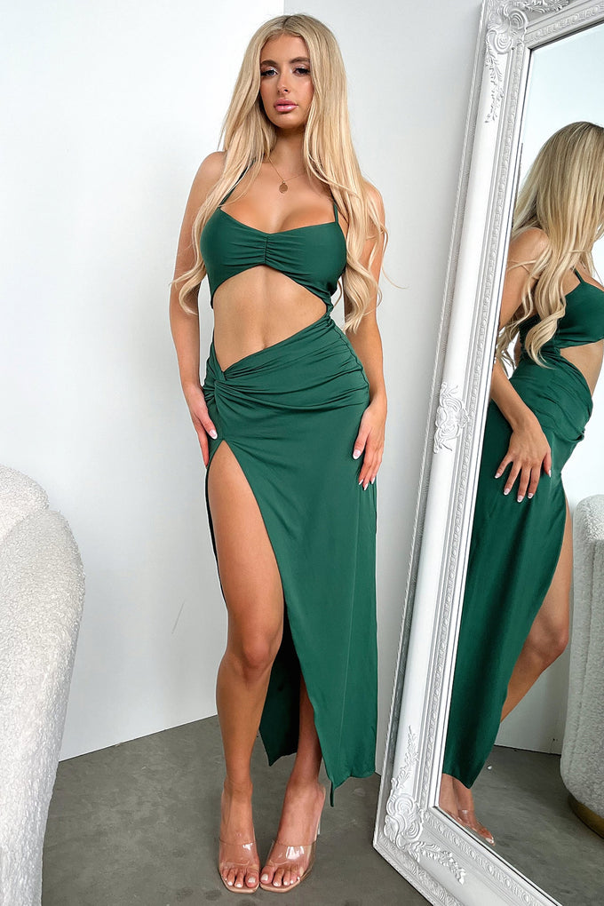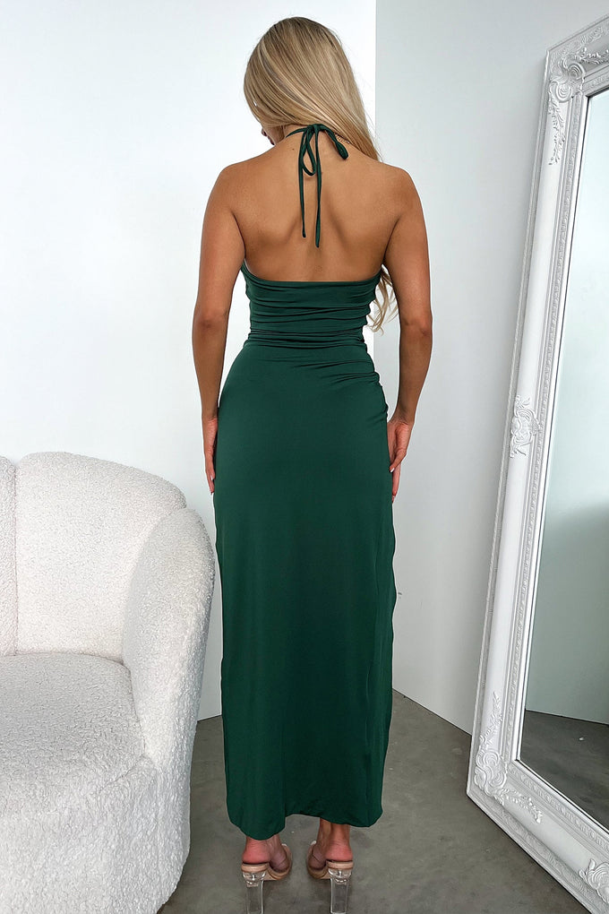 She's a 10/10! The Kyle Midi offers double lined material, a straight cut neckline with tie up halter straps, a cheeky thigh high slit and a cut out detail at the waist. Style her with white strappy heels and a bold red lip to make a statement!