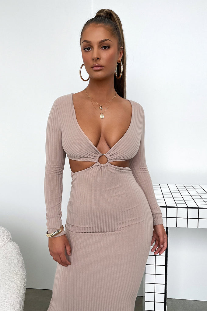 She's an absolute beauty and there's no denying it! The gorg new Laska Midi Dress features long sleeves, a v neck with an o-ring design, cut out edges that continue onto the back with a backless cut and double lined material. Style this stunner with nude heels, a silver choker + necklace and silver hoops for a chic golden hour goddess look.