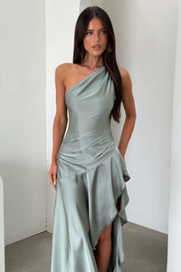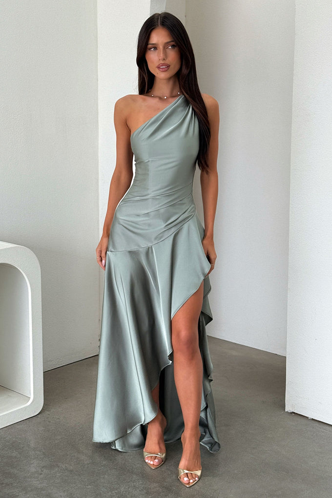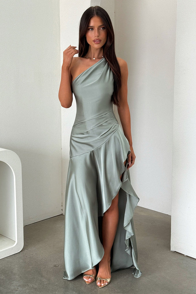 Slip into effortless elegance with the Leni One Shoulder Satin Maxi Dress! This showstopper features satin fabric with a chic one-shoulder silhouette anchored by an adjustable strap for the perfect fit. The lined bodice with mesh and invisible back zip provides support, while strategic waist ruching flatters your figure. A flowy frilled skirt and daring side leg split keep things fun and flirty. Dress it up with your go-to heels and gold jewellery for an unforgettable formal moment!