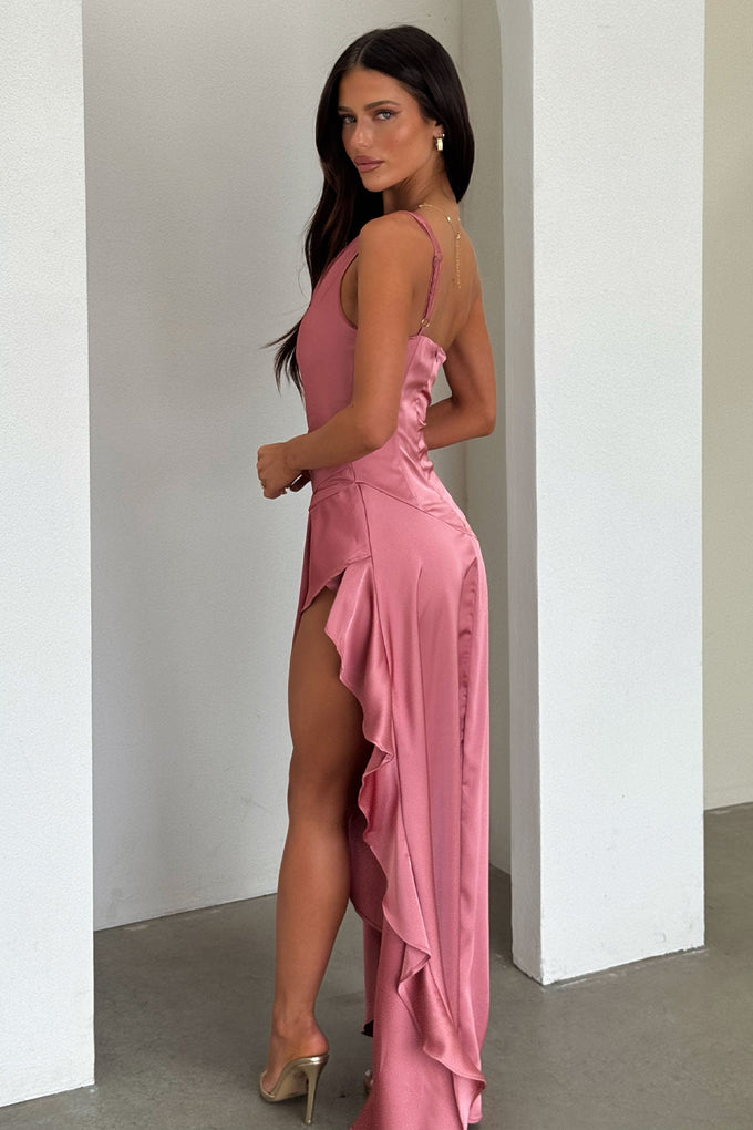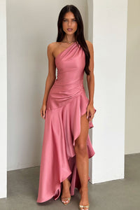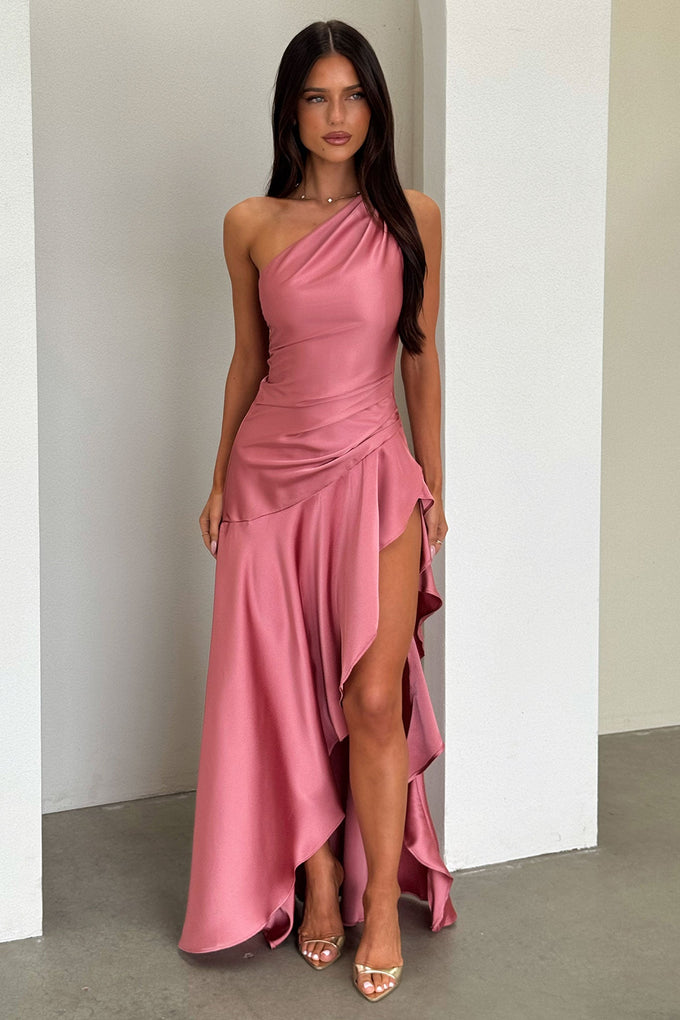 Slip into effortless elegance with the Leni One Shoulder Satin Maxi Dress! This showstopper features satin fabric with a chic one-shoulder silhouette anchored by an adjustable strap for the perfect fit. The lined bodice with mesh and invisible back zip provides support, while strategic waist ruching flatters your figure. A flowy frilled skirt and daring side leg split keep things fun and flirty. Dress it up with your go-to heels and gold jewellery for an unforgettable formal moment!