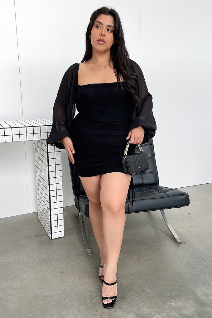 Stand out in the crowd in the Lorde Dress in Black. This babe features an all over ruched fabrication with tie up detail on each side of the dress, off the shoulder, sheer long sleeves and is completed with invisible back zipper. She looks amazing when paired with your go to nude heels and gold jewellery.
