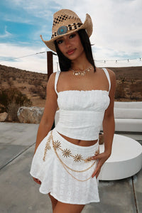 Add a touch of whimsy to your wardrobe with the Memphis Skirt! This mini skirt features a low rise fit and a beautiful floral embroidered design. Designed with built-in stretchy fabric shorts, it offers comfort and coverage. The invisible side zip with a hook and eye closure makes it easy to wear. Complete the look with the matching Memphis Top and your favorite boots for a playful and stylish ensemble!