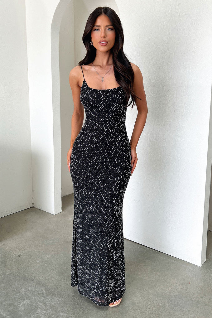 Shine bright in the Nalani Maxi Dress! This bodycon dress features rhinestones for added glamour, fully lined for comfort, and spaghetti straps for a flirty touch. Complete the look with basic heels and a small shoulder bag for your next night out. Just don't forget to sparkle!