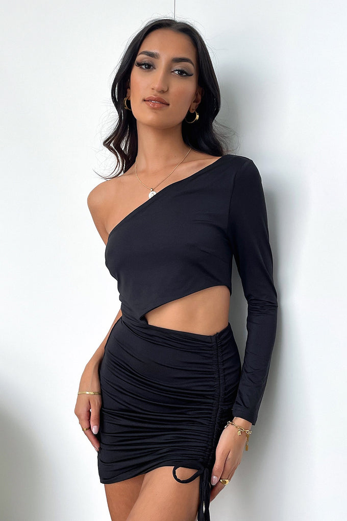 She's an 11/10, and a must have for your party wardrobe! The Naomi Dress features a one shoulder design with a long sleeve, a cut out detail along the side of the waist, as well as a ruched detail down the left side for an asymmetrical look and is made of double lined material with a bodycon fit. Style her for a hot night out with black heels and a red lip!