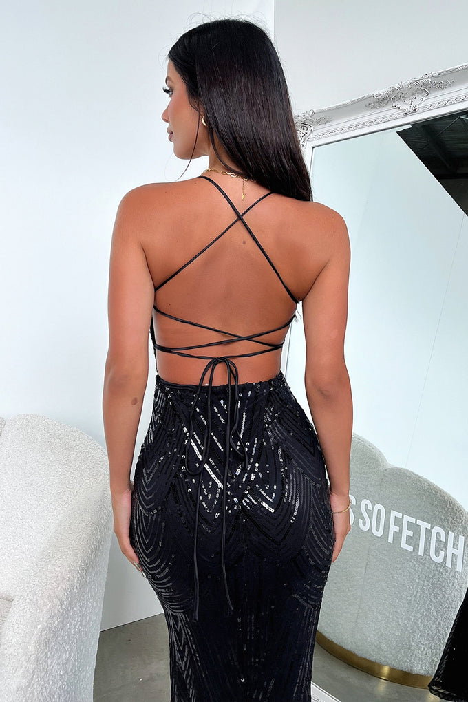 All eyes on you in the Nolan Maxi Dress! She features a bodycon fitting top, a mermaid style bottom, double lining, sequin detailing all over, a backless cut with tie up strings and an invisible back zipper. Style her with stiletto heels and a red lip for a bold look.