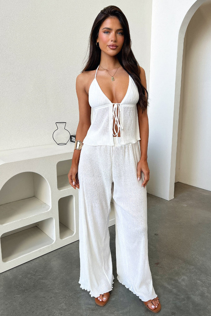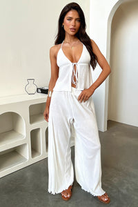 Cute and comfy! The Prisha Top offers a plisse material, halter neck ties, an open centre and lettuce trim edges. Style her with the matching pants and sandals for a casual off duty look.