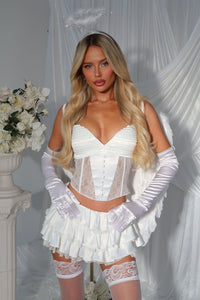 Turn heads with the Pure Intentions 2 Piece Set in White! This satin and lace combo features a satin top with delicate lace and button accents, nude mesh lining, structured boning, and a lace-up back for a perfect fit. Adjustable straps and silicone tape inside the neckline keep you comfortable and secure. The matching mini skirt includes built-in shorts and an invisible back zip with hook and eye closure for effortless wear. Complete your look by pairing it with matching wings, a halo, gloves, and stockings for the ultimate halloween look!