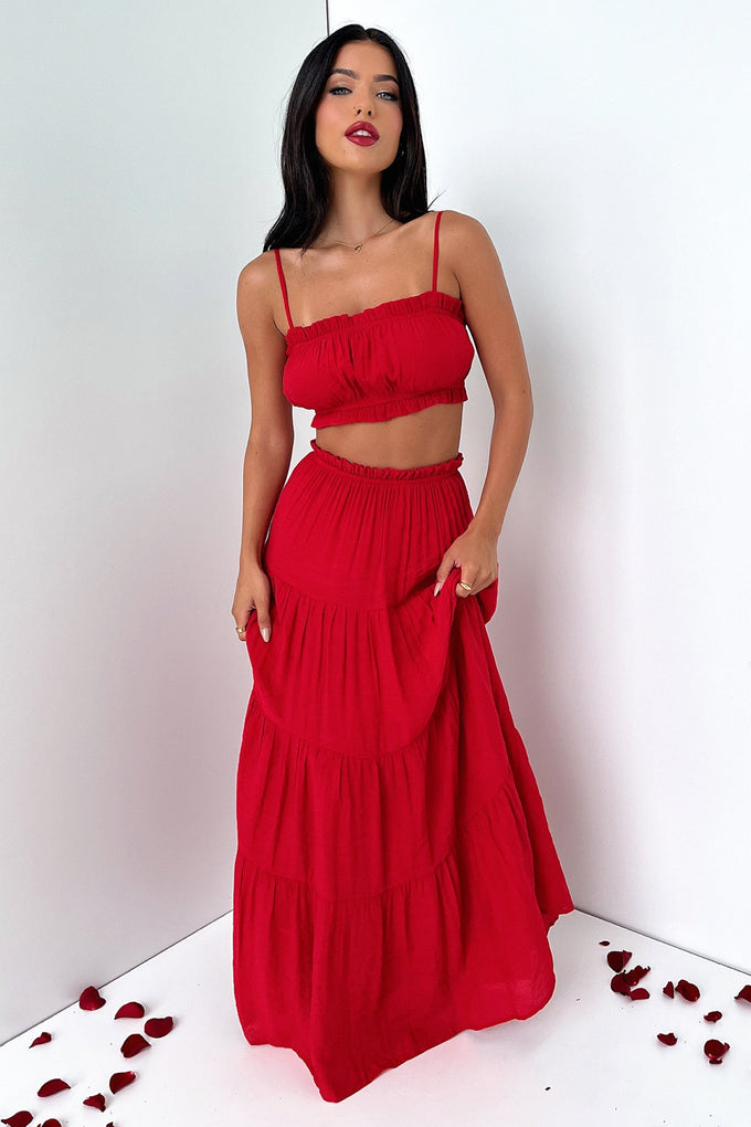 Summer vibes in the Selina Set! This gorg crop offers a frilly neckline with an elasticated band for lots of stretch, double lined material and thin adjustable straps. Style her with the matching skirt and a pair of White Sandals.