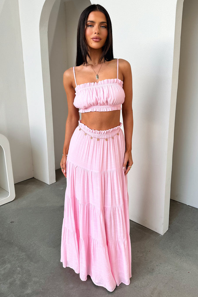 Summer vibing in the Selina Set! This gorg maxi skirt features an elasticated waistband with frilled edges, a flowy fitting skirt and double lined material. Style her with the matching crop and a pair of White Sandals.
