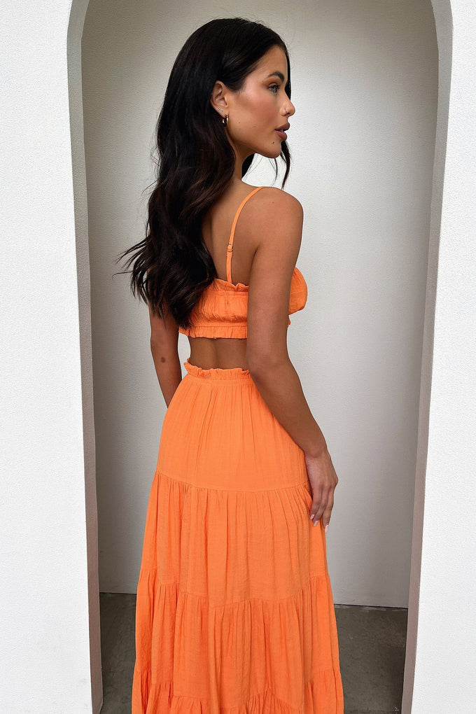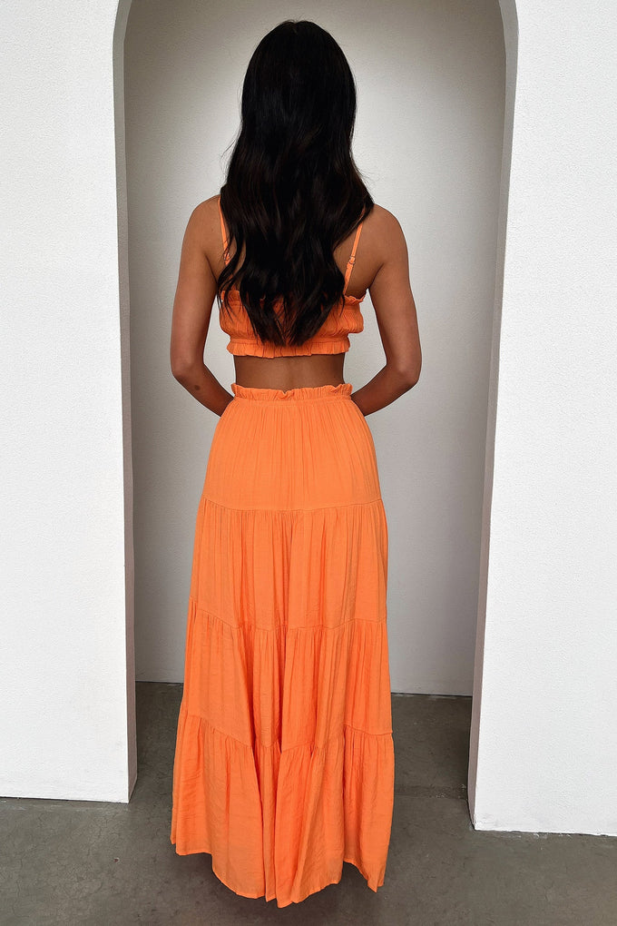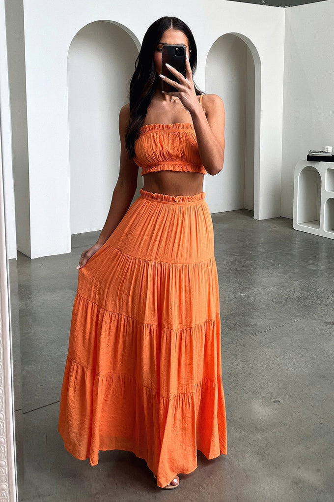 Summer vibing in the Selina Set! This gorg maxi skirt features an elasticated waistband with frilled edges, a flowy fitting skirt and double lined material. Style her with the matching crop and a pair of White Sandals.
