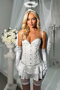 This satin skort is truly sent from Heaven - with a layered flowy skirt and attached stretchy shorts, it offers the perfect combination of style and comfort. The invisible zip in the back adds a touch of practicality, making it easy to wear. Pair it with the Sent from Heaven corset and other accessories for a heavenly ensemble!
