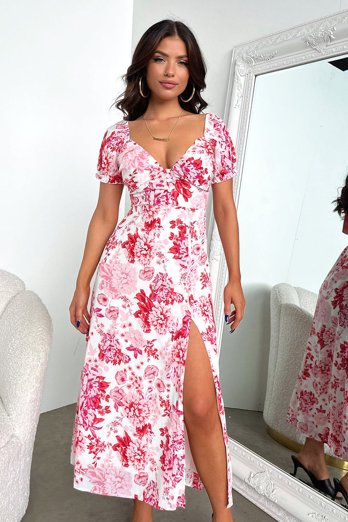 The prettiest dress for a cute Sunday brunch date! This beauty offers a sweetheart neckline, short puffy sleeves with frilled edges, buttons down the front, double lined bust, shirred material across the back, an invisible side zipper, a flowy fit and a cheeky side slit. Style her with Your go to flats, a little tote and some sunnies.