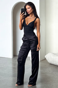 Introducing the Sophia Pants. These high-waisted, dressy cargo pants are a versatile addition to any wardrobe. Featuring four functional pockets, belt loops, and a zip and double hook closure, they pair perfectly with a crop and heels for a classy look. Upgrade your style game with Sophia Pants!
