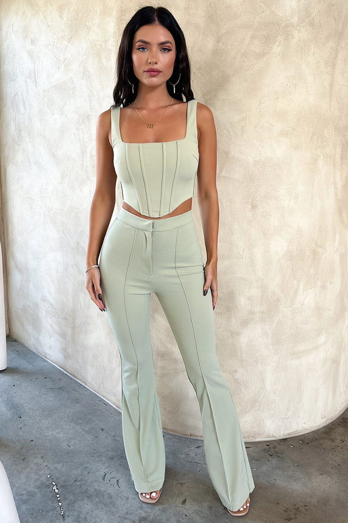 New go-to pants to wear on repeat! She offers a flared bottom, lining down the front, a hidden zip + clasp closure at the waistline and a supper flattering fit. She'd go perfect paired with a white long sleeve crop, black heels and a red hot lip.