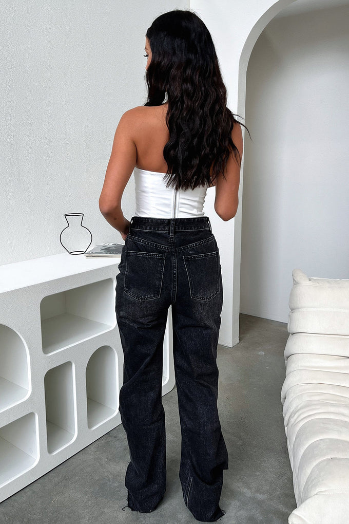 When we say you're gonna fall in love with her, we mean it! Hands down the best pair of denim jeans you'll ever own! She's got lots to offer with a semi-wide leg fit with a raw bottom edge, rips at the knee, 2 functioning front+back pockets, a black denim wash look and a silver button + zip closure. Style her chic with a white crop + white sneaks and layer it up with a flannel + some chunky silver jewellery and a pair of sunnies.