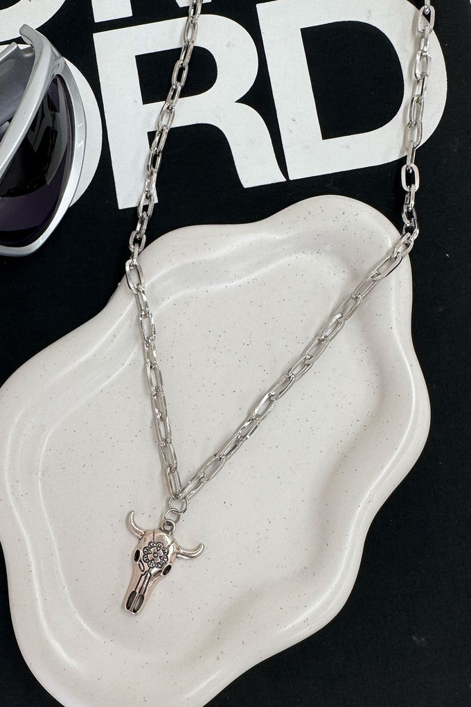 Get ready for festival season with the Wyoming Necklace! This silver chain necklace features a unique bull pendant, adding a touch of whimsy to your Coachella outfit. Its versatile design makes it the ideal accessory for any occasion!